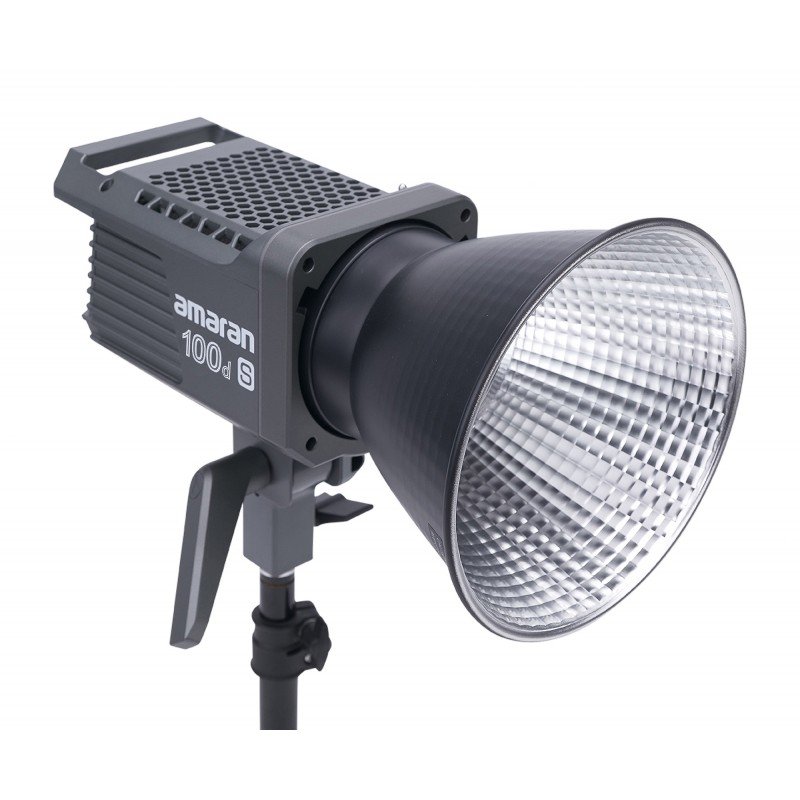 The Amaran 100d S is a compact 100 W LED light source. It is the successor to the popular Amaran 100d model with an improved chipset. Thanks to the technological solutions used, the unit offers even better light quality. It guarantees smooth brightness control, a constant colour temperature (5600 K) and a generous beam angle (110.9º without modifier). The package also includes a Hyper Reflector canopy, which focuses the beam while increasing its intensity. Convenient operation of the unit is provided by a control panel with a large LCD display. The lamp can also be controlled remotely using the Sidus Link mobile app. Main product features 100 W LED lamp improved successor to the Amaran 100d Even better LED chipset allowing for more accurate colour reproduction CRI (96+CRI) CRI (96+) / TLCI (99+) / CQS (95+) / TM-30 RF (96) / TM-30 RG (103) / SSI D56 (86+) solid colour temperature of 5600 K provides natural daylight of high quality impressive luminous flux of 10000 lm maximum light intensity of 149200 lux (at a distance of 0.5 m using the Hyper Reflector canopy) bright and easy to read LCD display support for the Sidus Link mobile app control via smartphone or tablet from up to 100 metres 8 preset special effects (including broken bulb, TV, explosion, strobe) Ambrella hole integrated into the flash infinitely adjustable brightness via a knob Hyper Reflector canopy included Exceptional quality at a reasonable price The Amaran 100d S lamp features an innovative chipset with two LEDs, resulting in excellent light quality and colour accuracy. Compared to the 100d model, the SSI score here is 14 points higher (86+). Quality has also been improved in terms of other parameters: CRI (96+), TLCI (99+), CQS (95+), TM-30 RF (95) and TM-30 RG (103). This allows the lamp to compete with more expensive models used in professional video productions. Big power Thanks to a state-of-the-art chipset with two LEDs, the 100 W lamp produces light with a strength comparable to a traditional 750 W tungsten bulb. The unit generates a luminous flux of 10000 lumens. The combination of the lamp with the Hyper Reflector canopy allows to achieve a light intensity of up to 149200 lux! Multiple applications The Amaran 100d S will prove its worth on film and photography sets, in the home studio, as well as when recording vlogs, streams or live broadcasts. Excellent colour reproduction ensures that the skin of those performing in front of the camera or camcorder will look natural. The improved chipset in the Amaran 100d S allows even more flexibility when working, delivering light of excellent quality. Daylight The Amaran 100d S produces light with a colour temperature of 5600 K, which is an ideal choice for filmmakers and photographers looking for even and natural lighting. These parameters correspond to the conditions experienced during sunny days. The Amaran 100d S will allow you to maintain uniform colours on a film or photography set, making it easier to work with your camera or camcorder. Sidus Link app Sidus Link technology gives filmmakers tremendous possibilities, allowing you to control individual Amaran and Aputure lamps or groups of these devices from your smartphone. The Sidus Link app will give you access to all lamp functions, as well as allowing you to modify standard settings and save your own. Lamps running on the Sidus Mesh system can connect to each other, increasing the range of the entire network, giving you great freedom when working with light. Hollywood special effects The Amaran 100d S offers 8 built-in special effects to simulate paparazzi flashes, fireworks, a broken light bulb, lightning strikes, TV, pulsating light, flashes and explosions, among others. With these, you can enhance your videos with a wow effect without having to increase your production budget. Compact design In a fast-paced world, time is at a premium. The Amaran range of products is designed to allow you to work efficiently. The small size and weight make these lamps extremely user-friendly and transportable. You can easily mount the Amaran 100d S model on a tall lighting tripod or boom, and easily pack the unit into a regular camera bag after the shoot. The whole set weighs just over 3 kg! Bowens mount The Amaran 100d S supports the popular Bowens standard, used to mount popular light modifiers. It is a widely used solution in the world of film and photography. Hundreds of accessories such as gates, canopies, softboxes, grids or injectors are compatible with the Amaran 100d S. Also noteworthy is the umbrella hole located on the integrated flash mount. Specification model: Amaran 100d S light colour temperature: 5600 K CRI: 96+ TLCI: 99+ CQS: 95+ TM-30 RF: 96 (averaged value) TM-30 RG: 103 (averaged value) SSI (D56): 86+ maximum output power: 100 W maximum power consumption: 110.9 W luminous flux: 10000 lm Angle of illumination: without modifier: 110.9º with Hyper Reflector: 17.1º Power supply: DC: 48 V / 2.7 A AC: 100 V – 240 V / 2.7 A AC: 100 V – 240 V / 2 A Power supply: 100 V – 240 V / 2 A Allowed operating temperature: -10°C – 40°C Control: lamp control panel Sidus Link application maximum remote control range: 100 m (Bluetooth) display: LCD cooling: active Dimensions: lamp without mounting bracket: 207 x 115 x 115 mm lamp with mounting bracket: 207 x 119 x 200 mm power supply: 137 x 59 x 36 mm power cable: 300 cm Weight: lamp: 1.42 g power supply: 490 g whole kit: 3.268 kg Kit contents Amaran 100d S LED lamp Hyper Reflector canopy with Bowens mount protective shield power cable power supply photometry CCT Distance No modifier Hyper Reflector 5600 K 0.5 m 15870 lx 149200 lx 1 m 4060 lx 34600 lx 3 m 490 lx 3750 lx 5 m 189 lx 1302 lx