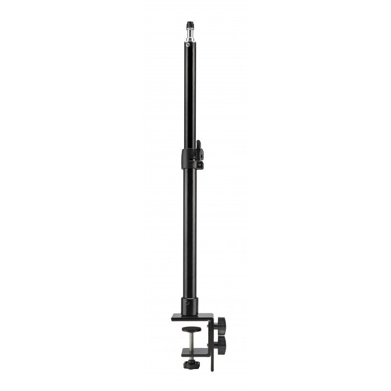 The Camrock CM-50 is a lightweight, 2-section tripod made of aluminium. The use of an ergonomic desk clamp will allow it to be easily attached to tabletops or tables. It will be an ideal choice for video makers, streamers or those running webinars and online classes. The clamp is compatible with desks up to 8 cm thick. You can easily install a flash, LED panel, preview monitor or light modifier on the tripod. Its height can be adjusted from 34.5 to 58 cm. The unit is fitted with a standard 16 mm stem ending in a 1/4″ thread. Main product features ergonomic lighting tripod secure mounting with desk clamp provides convenient organisation for working with LED, studio and reporter lights equipped with a standard 16 mm stem 1/4″ thread for compatibility with hundreds of devices maximum height of 58 cm 2 centre column sections quick and convenient assembly fast and easy assembly lightweight and sturdy construction made of aluminium solid lockable clamps for infinite height adjustment clamp protected by soft protective facings Desks, tops and tables Don’t have room for a traditional 3-legged tripod? Or do you want the equipment you need to record vlogs or streams always at hand? The Camrock CM-50 tripod will work wherever ergonomics and convenient access to your equipment is important. The office clamp will enable comfortable mounting to tabletops, desks and tables with a maximum thickness of 8 cm. The sturdy clamp based on 2 screws will ensure that the tripod will always remain in place and the soft padding will adequately protect your furniture. Stable construction The lightweight aluminium from which the tripod is made is a guarantee of durability and stability. It is equipped with a solid clamp, which allows you to adjust the length of the 2-section column from 34.5 to 58 cm. This design allows you to work with light in a convenient way and adjust the height of the tripod accordingly to the current needs of your frames. Variety of applications The Camrock CM-50 lighting tripod is equipped with a popular 16 mm mandrel, which is compatible with hundreds of lamps available on the market. However, the capabilities of this model do not end there. The stem culminates in a 1/4 inch thread that will allow you to mount many other accessories, heads or additional mounts. In an emergency situation, you can also install a camera on the tripod. Lightweight construction A tripod with an office clamp is not only a great way to have a home video maker stand. You will also successfully use it in the field, where you can easily connect it to various types of railings or supports. When folded, its length is 44.5 cm. Thanks to the use of lightweight aluminium alloy, you don’t have to worry about the weight of the device. Its weight is just 434 g, which is sure to please makers who often travel with a tripod under their arm! Capability: Desk and table tops up to 8 cm thick (vise mount with 2 screws) Specification Model: Camrock CM-50 Colour: black Material: aluminium Mounts: male tripod thread 1/4″ shank 16 mm Number of sections: 2 Minimum height: 34.5 cm Maximum height: 58 cm Length when folded: 44.5 cm Section diameter: 2.5 / 2.2 cm Clamping range: 0.5 cm – 8 cm Weight: 434 g Kit contents Camrock CM-50 tripod Thread protection cap