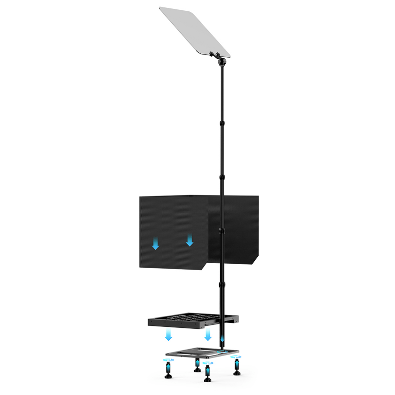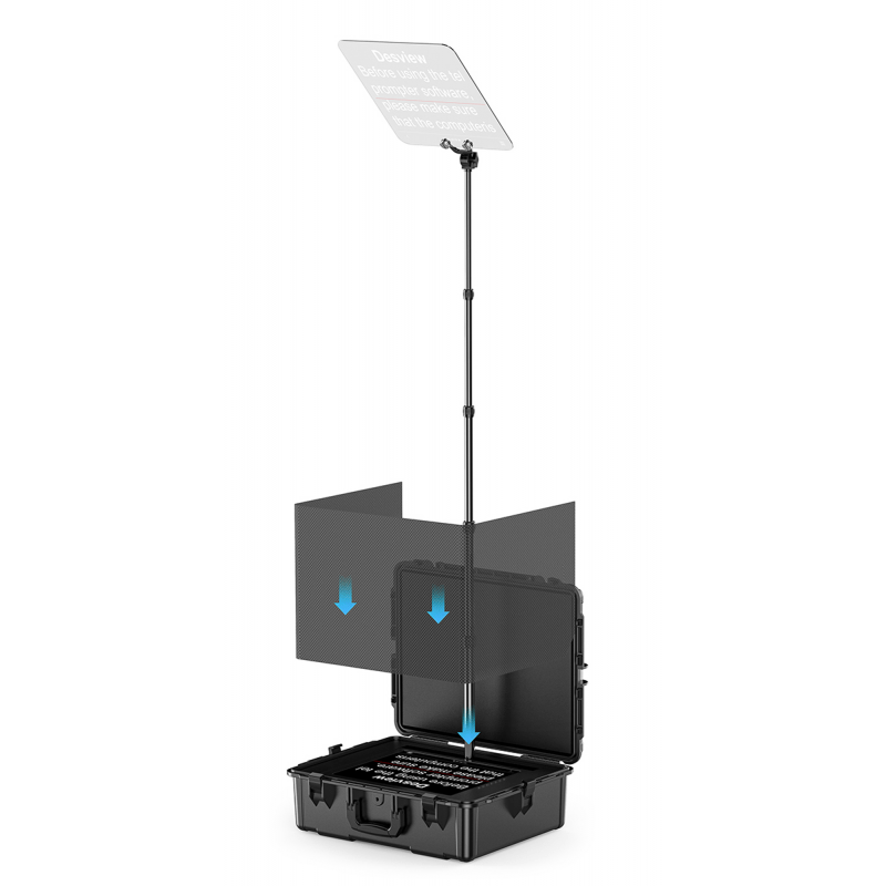 The Desview TP300 is a construction that is often referred to as a presidential teleprompter. The device is designed for public speaking and live recordings. Equipped with a transparent glass panel with high light transmission, it allows presenters to maintain natural eye contact with the audience while keeping an eye on their speech or script. Thanks to its clever design and portable case, the Desview TP300 is ready to use in just 60 seconds. The included 19’ monitor (1000 nits brightness) ensures excellent readability even in bright light. The device supports HDMI, SDI and USB ports, and the Bluetooth remote control and mobile app allow for remote text control. Key product features professional presidential teleprompter proven design known from rallies and public appearances transparent glass panel is almost imperceptible to viewers sturdy transport case with an easy-to-open system quick assembly without tools – ready for use in less than 60 seconds bright 19’ monitor in a sturdy metal housing Includes sunshade to protect against glare and bright light 2 mounting methods: directly in the case or using an external stand (included) 3 mm thick glass with 97% light transmission adjustable mirror angle (glass pane) from 45° to 90° for perfect visibility HDMI and SDI inputs and outputs for a wide range of compatibility with other devices Bluetooth remote control for functions such as text rewind and stop speed control USB flash drive with software included (Windows, MacOS) many text editing options: font size, background colour, mirroring designed for a variety of applications – from live conferences to studio recordings durable, non-slip design for stability on any surface complete set of accessories: including 5-metre HDMI cable, flash drive with software, USB dongle, power adapter and monopod Professional presidential teleprompter The Desview TP300 is based on the design of the so-called ‘presidential teleprompter’, which is often used at political rallies and speeches. The transparent glass panel on a slim frame allows leaders and speakers to speak freely and maintain eye contact with the audience. Thanks to the use of special light-splitting glass, the text is only visible to the speaker. This discreet solution is an effective aid for public appearances and video recordings. The Desview TP300 presidential teleprompter will make you feel even more confident and professional. Ready to use in 60 seconds The Desview TP300 teleprompter’s clever folding system is what makes it stand out. All components, from the mirror to the monitor, fit perfectly into the portable case. The perfectly fitting screws allow for quick assembly. You don’t need any additional tools or specialised skills. This means that in just one minute you can go from a folded case to a fully functional teleprompter, ready for live recordings or a press conference. 2 mounting options Depending on the situation, you can choose the method that best suits your needs. The 19’ screen can be placed in a case to which you attach a retractable monopod with a transparent glass panel. This solution works well wherever time is of the essence. You can also use the external screen frame and non-slip feet. This makes the Desview TP300 teleprompter effective both on static studio sets and in dynamic conference settings. Unique light-diffusing glass At the heart of the teleprompter is a high-quality 3 mm thick glass that diffuses the light beam. This makes the Desview TP300 look like an ordinary, inconspicuous pane of glass on a monopod from the viewer’s perspective. At the same time, the presenter or speaker can see a clear, sharp text that is displayed on a monitor placed at ground level. This way, you don’t have to worry about forgetting your lines, and at the same time, you remain completely natural when interacting with the audience or the camera. Sun shield Are you fed up with struggling with reflections and overexposure when there are a lot of artificial light sources on set? Or do you have this problem when working outdoors? You don’t have to worry about that when you choose the Desview TP300 presidential teleprompter. The set includes a light shield that minimises reflections and helps to maintain a clear image even in bright surroundings. You can record in the studio, work on a stage full of spotlights, or even in an open space – the content displayed on the teleprompter will always be clearly visible. Bright and reliable 19-inch monitor The set includes a 19’ monitor in a metal housing with a brightness of 1000 nits and a resolution of 1280×1024. This combination guarantees a strong, easy-to-read image even on sunny days. The robust metal construction makes the monitor impact and heat resistant, and the tilt angle adjustment (from 45° to 90°) allows you to adjust the setting to the preferences of the director or presenter. One prompter, multiple devices The Desview TP300 teleprompter offers flexibility thanks to its multiple ports: HDMI and SDI inputs and outputs, as well as USB data transmission. What does this mean in practice? You can connect it to various devices – from the monitor included in the set to laptops or external monitors. The image from the device can be transferred to a large screen in the studio, and if necessary, you can also display what is on your computer screen on the teleprompter screen. This makes the TP300 suitable for both dynamic TV productions and more relaxed company presentations or online broadcasts. Remote control at your fingertips The Desview TP300 teleprompter comes with a Bluetooth remote control that gives you full control over the displayed text without having to go near the device. With it, you can change the font size, adjust the scrolling speed and stop the text at any time. It is ideal for presenters and speakers who need to react quickly to the changing dynamics of their speeches. With the remote control, you can keep your presentation flowing and focus 