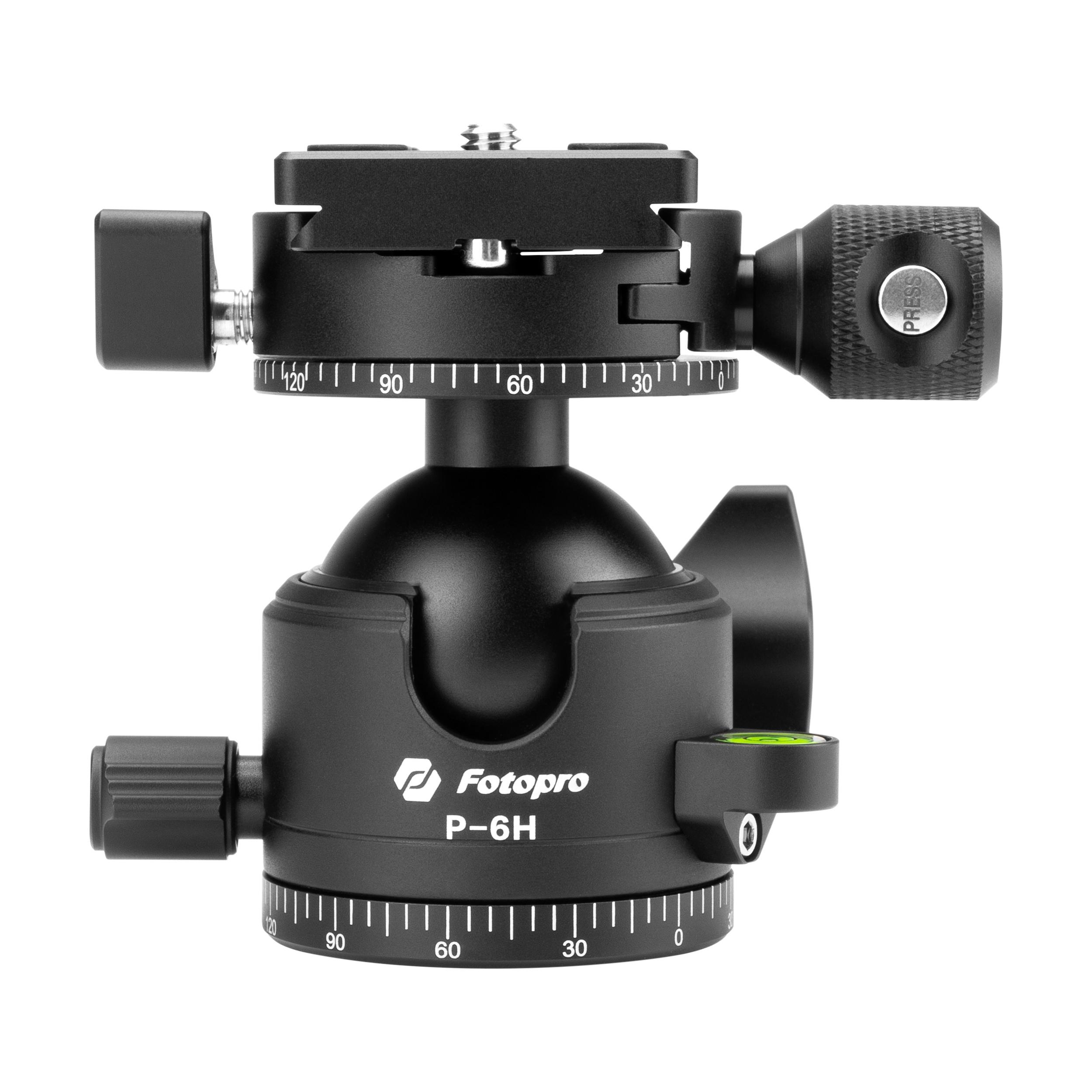 The Fotopro P-6H ball head is an extremely precise tool. It features a dual panning mode, a low profile design and a multi-stage clamp force adjustment clutch. Its maximum load capacity of 10 kg guarantees solid support for cameras with heavy lenses. Precision and freedom of movement The dual panning mode will especially appeal to landscape photographers. It will allow them to capture breathtaking panoramas in a simple and extremely precise way. Separate knob allows to regulate the friction force, adjusting the clamping force to the weight of the set installed on the head. Solid base The Fotopro P-6H’s low-profile design means that with its compact size and 325 g dead weight, it can support up to 10 kg of equipment! Large DSLRs and heavy telephoto lenses are not a challenge. Arca-Swiss standard The included quick release plate is compatible with the popular Arca-Swiss standard. The quick release plate has non-slip rubber facings that grip perfectly to the equipment attached to it. Thanks to the quick release plate, mounting/removing the camera from the head is quick and safe at the same time. Quick release lock Fotopro has thought of an additional safety feature that will protect your valuable equipment from accidentally slipping off the head. The head is equipped with a simple and extremely effective double quick release locking mechanism. Guarantee of reliability Thoughtful design, high quality materials and precision of workmanship guarantee that the product will last for years. It is confirmed by 6 year manufacturer warranty! Specification model: Fotopro P-6H color: black head type: ball head material: aluminum alloy maximum load: 10 kg weight: 325 g height: 7.4 cm diameter of the base: 4.9 cm ball diameter: 4.0 cm horizontal rotation: 360 vertical rotation: -/+ 90 attachments: head: 3/8″ female tripod thread quick release plate: 1/4″ male tripod thread other product features: two spirit levels three independent tilt and pan lock knobs clutch – adjustable ball clamping power angle graduations for accurate panning compatibility with Arca-Swiss quick-mount plates lock to prevent accidental removal of quick release plate Set contents P-6H Fotopro ball head – black Arca-Swiss quick release plate