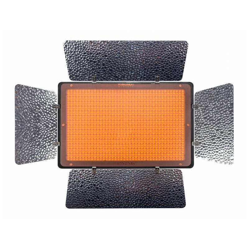 The Yongnuo YN1200 is a compact, high-power LED lamp designed for lighting large film sets, both in the studio and outdoors. The lamp’s light panel is made up of as many as 1,200 high-performance LEDs, half of which emit light with a colour temperature of 3,200 K and the other half with a temperature of 5,500 K. Thanks to the functionality of changing the intensity of the light generated by the individual groups of LEDs, the lamp offers the possibility of smoothly adjusting the power and colour temperature of the light between 3200 K and 5500 K. The natural characteristics of the emitted light are evidenced by the high CRI coefficient (95+). The lamp allows precise control over the direction of incidence and the character of the light generated. This is made possible by integrated gates and magnetically attached light modifiers – a milky diffuser and a CTO filter. The diffuser placed at the front of the lamp diffuses the light and gives it a pleasant softness (eliminates harsh shadows). The orange CTO filter produces a much warmer light colour. Both modifiers provide additional protection for the light panel against damage. The lamp is also protected against overheating thanks to an effective ventilation system. The lamp can be controlled via a control panel, located on the back of the unit, and wirelessly using a remote control or a mobile app on a smartphone. Both remote methods allow grouping and control of the operating parameters of multiple lamps simultaneously. Power for the YN1200 can be supplied via a 19 V / 5 A mains adapter or four NP-F series lithium-ion batteries. The two power options make the flash ideal for both studio and field use. The lightweight design and 1/4″ female tripod mount allow for ‘handheld’ work and tripod mounting. A protective case for the lamp and a handle are also included. Specifications dimensions: 32.5 x 21 x 3.5 cm weight: 1030 g (without accessories) number of LEDs: 600 LEDs with a colour temperature of 3200 K 600 LEDs with a colour temperature of 5500 K colour temperature of emitted light: adjustable between 3200 K and 5500 K emitted light factor CRI > 95 LED beam angle: 55° power: 72 W luminous flux: 9300 lm wireless control range: up to 15 m Bluetooth module for control via mobile app Compatibility battery power: NP-F series batteries (not supplied) mains power: Yongnuo FJ-SW195000F 19 V, 5 A DC power adapter (not supplied) Kit contents Yongnuo YN1200 flash – WB (3200 K – 5500 K) wireless remote control milky diffuser CTO filter bracket carrying case