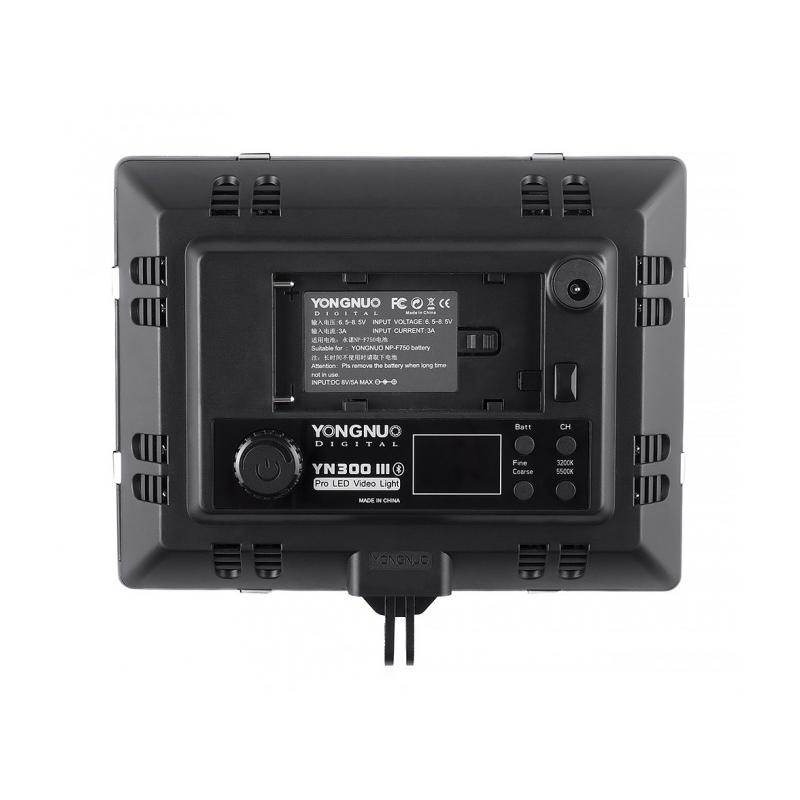 LED lamp Yongnuo YN-300III LED (3200-5500K) is a high quality, reliable and efficient device, allowing for even illumination when shooting or filming. YN-300III LED (3200-5500K) LED has 300 gates and allow precise control over light. built-in diodes of two types (300szt) provide light with a color temperature of 3200 to 5500 Kelvin. Light output and color temperature can be adjusted continuously by means of a knob. The device is equipped with a switch for changing the brightness in increments of 10% or precision of 1%. Reflector is equipped with a control and battery power indicator. The device uses a built-in Bluetooth receiver that allows remote control of the parameters of the lamp using the included remote control or a phone or tablet (Android 4.0 or higher, iOS 7.0 or higher) installed application. You can control up to 8 groups of lights! The lamp has included hot shoe adapter type, so it can be mounted directly on the camera or camcorder. Tripod thread 1/4 “into the socket can be mounted on a standard photographic tripod. Included is also a comfortable grip” handle “allows you to hold in your hand lamps on tripods and lighting installation.
