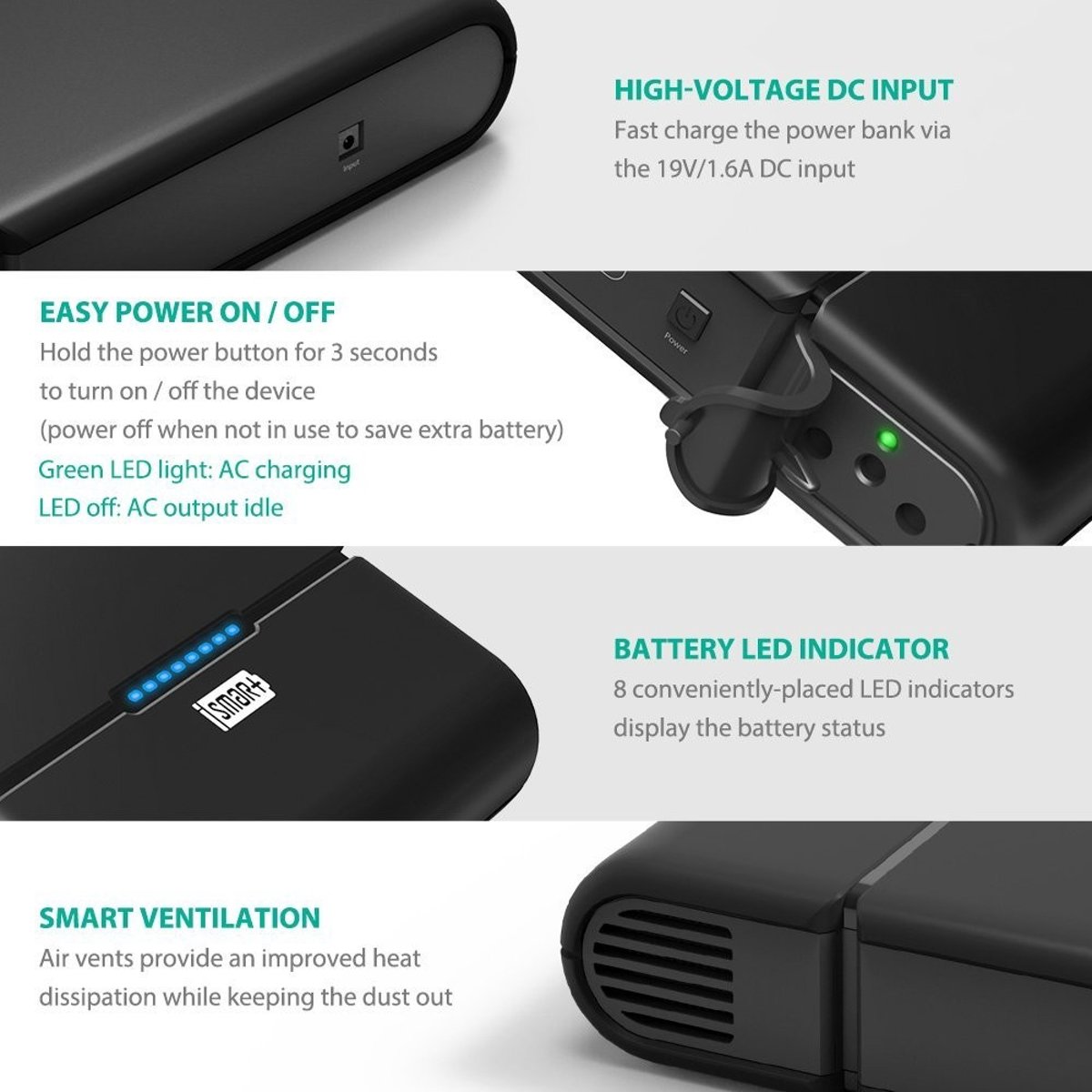 The 27,000mAh Universal Power Bank from RAVPower is a lightweight and portable battery pack that allows you to charge multiple devices at once using its one 3.0A USB Type-C port, two iSmart 2.4A USB Type-A ports, and one 220V output, which can support a maximum of 100W.