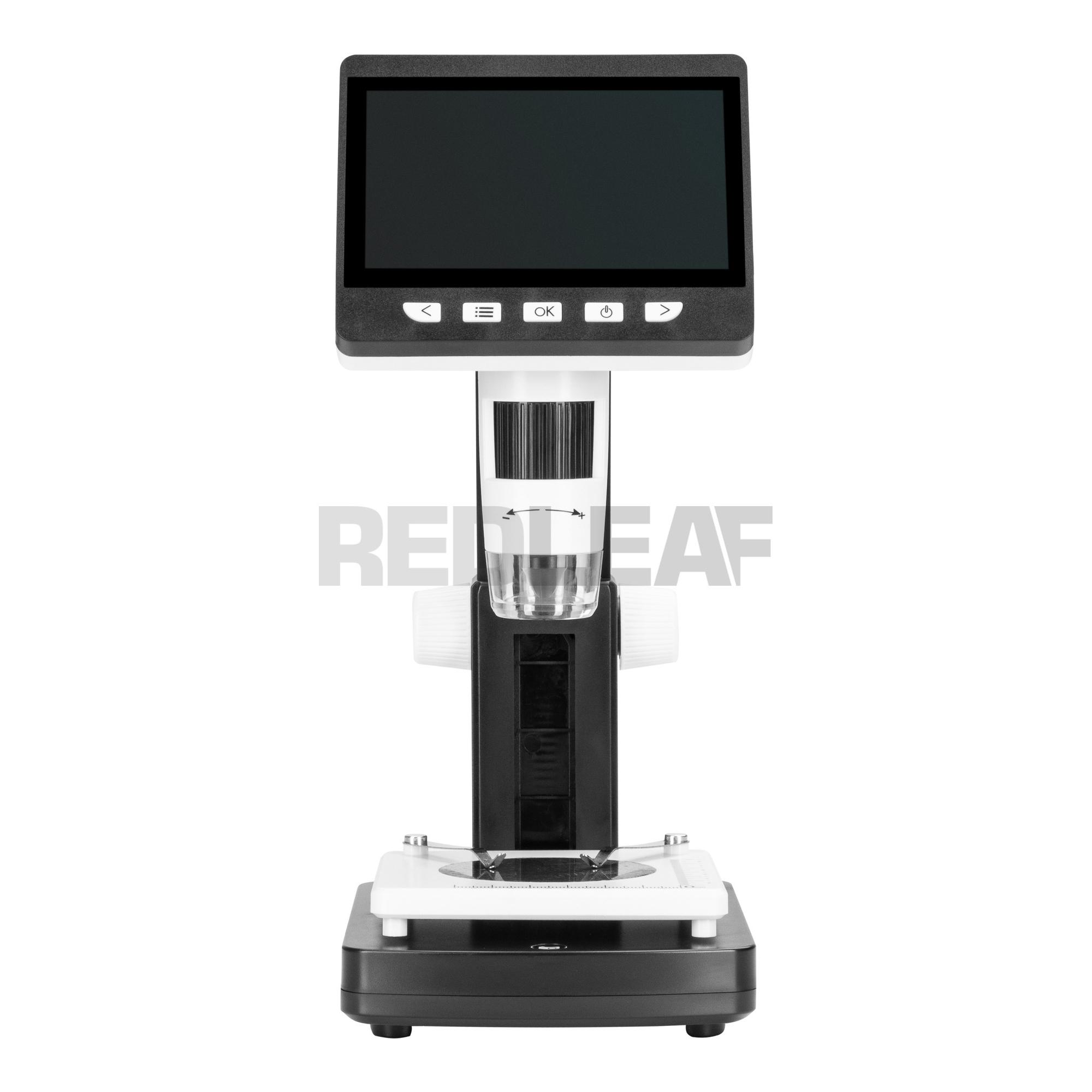 Convenient handling The shape of the Redleaf RDE-71000M resembles traditional microscopes found in professional laboratories. All the adjustment knobs are within easy reach, so it only takes a few seconds to find the optimal position. The tested preparations and objects are immobilized by means of metal grips. Once the moving table is set at the correct height, all you need to do is adjust the focus. The traditional eyepiece, which many people will remember from their biology lessons, has been replaced by a 4.3-inch LCD screen. In addition, in the lower part of the microscope housing there is a dedicated button that allows you to take a picture or record a movie with a single click. More than one screen The Redleaf RDE-71000M digital microscope offers a 1000x zoom to see the smallest details of objects viewed on a 4.3-inch LCD screen. Using the micro USB port, we can connect the device to a computer, on which we use dedicated software. The housing of the microscope also includes a micro HDMI port, which allows you to display the enlarged image on a monitor or TV screen. Photos and videos can also be saved directly on the microSD card. Control from the screen level The integrated screen is not only a convenient real-time view. Using the physical buttons underneath the display, you can set many image parameters. These include exposure, white balance, sharpness and resolution. Extreme buttons marked with arrows will also allow you to use an additional, digital zoom, which will show even more details and details of the micro-world seen through the eye of the microscope. Specifications – model: digital microscope Redleaf RDE-71000M – approximation: from x50 to x1000 – digital zoom: x4 – the screen: TFT, 4.3 inch, 16:9. – sensor: CMOS, 2 Mpx – light source: 8 LEDs – sharpening range: from 0 to 40 mm (manual) – aperture: f/4,5 – angle of view: 16° – frame rate per second: 30 fps – saved file formats: JPG/AVI – maximum resolution of the images: 2400 x 1080 px – maximum video resolution: 1920 x 1080 px – supported operating systems: Windows (XP, Vista, Win7/8/10), Mac (10.5 or later) – the battery: 1500 mAh, lithium-ion, 3.7 V – working time per charge: 4 h – charging time: 4 h – ports: micro USB, micro HDMI, microSD card slot Set contents – a microscope with an LCD screen – charging cable – plastic box for 5 slides – 2 slides with preparations (bee wing, onion) – cleaning cloth