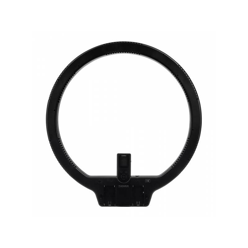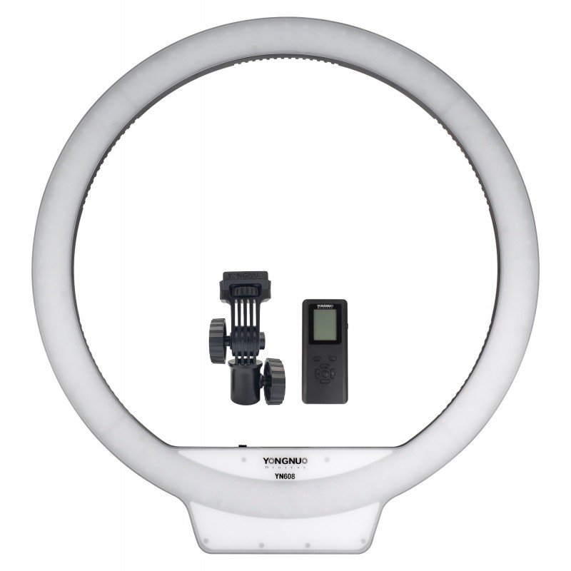 The Yongnuo YN608 is a large ring LED flash designed for creative lighting in the studio and in the field. The light panel consists of 608 high-performance LEDs with a colour temperature of 5500 K. The natural characteristics of the emitted light are evidenced by the high CRI (95+). A diffusion panel on the front of the lamp protects the LEDs from damage, while diffusing the light and giving it a pleasant softness. The lamp is controlled by a wireless remote control, equipped with an easy-to-read LCD display and convenient buttons. The remote allows grouping and remote control of multiple lamps simultaneously, as well as control of other Yongnuo lamp models including: YN308, YN360, and YN600 RGB. The lamp’s built-in Bluetooth module offers remote control of the panel using a mobile app on a smartphone. The YN608 can be powered by a 12 V / 5 A mains adapter or by two NP-F series lithium-ion batteries. The different power options make the flash ideal for both studio and field use. The lightweight design and 1/4″ female tripod mount allow for “handheld” work and tripod mounting. Also included is a mounting joint for lighting tripods and a sturdy carrying case. Specification model: Yongnuo YN608 – WB (5500 K) power: 36.5 W luminous flux: 4864 lm CRI: 95+ colour temperature of light: 5500 K number of LEDs: 608 LEDs with a colour temperature of 5500 K angle of light: 55° Control: wireless remote control Bluetooth module for control via a mobile app on a smartphone wireless control range of up to 15 m Power supply: rechargeable: two NP-F rechargeable batteries (not supplied) current: 8-12 V / 5 A DC power supply e.g. Yongnuo FJ-SW1205000D (not supplied) mount: tripod female 1/4″ dimensions: 52.5 x 52.5 x 3 cm weight: 1795 g (without battery) Kit contents Yongnuo YN608 LED ring light – WB (5500 K) wireless remote control mounting pivot for lighting tripods case for lamp and accessories