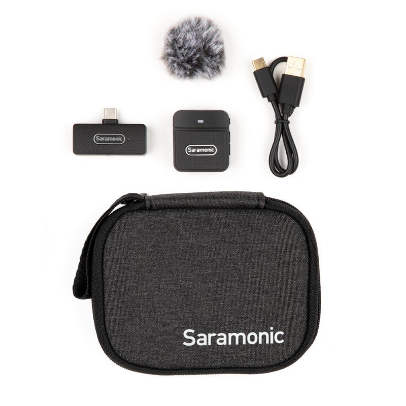 Saramonic Blink100 B5 wireless audio transmission kit (RXUC + TX) The wireless audio transmission kit Saramonic Blink100 B5 (RXUC + TX) will allow you to conveniently work with smartphones, tablets or computers equipped with a USB-C port. This system is sure to be appreciated by web creators, youtubers and those recording live broadcasts. The set includes 1 Blink100 TX transmitter and 1 Blink100 RXUC receiver. You can charge the device you are using during your recordings via an additional USB-C port. The audio transmission range is 50 metres. A full charge of the transmitter’s built-in battery will provide up to 10 hours of continuous operation. The devices feature an auto-pairing system and noise cancellation mode. The kit does not lack the necessary cables and a deadcat wind shield. Main product features wireless audio transmission kit with 1 receiver and 1 transmitter a great choice for vloggers, youtubers, web creators and journalists compatible with USB-C equipped devices ideal for working with smartphones, tablets or computers ultralightweight and compact transmitter with built-in omnidirectional microphone recording 360º sound charging the transmitter via the popular USB-C port USB-C port located on the receiver allows charging of the smartphone or tablet to which the device is connected support for superfast charging compatible with QC 2.0 and PD 2.0 protocols intelligent ambient noise cancellation fast automatic pairing of transmitter and receiver transmitter equipped with a clip for attaching to clothing colour LED to indicate operating status maximum range is 50 metres up to 10 hours of operation on a single charge wind shield included Tens of uses The two microports included in the kit (transmitter and receiver) are perfect for the nature of the work of vloggers, journalists, video makers and filmmakers working at weddings and conferences. The Saramonic Blink100 B5 Wireless Audio Transmission Kit (RXUC + TX) provides a maximum signal range of 50 metres. This allows the person being recorded to move freely with the transmitter and high quality audio will be captured by the receiver without any interference. Smartphones, tablets and computers with USB-C port The Saramonic Blink100 B5 Wireless Audio Transmission Kit (RXUC + TX) was developed specifically for smartphone, tablet and computer users. Unlike the B1, B2, B3 and B4 variants (available as separate products), it relies on the USB-C standard, which is growing in popularity every year. The connector used in the receiver can easily be connected to the mobile device of your choice, even if it is in an armoured case! Explore the entire Blink100 family! The devices you use for audio recording are not equipped with a USB-C port? No problem. The Saramonic Blink100 family has no shortage of kits offering alternative receiver versions. Variants B1 and B2 will easily connect to cameras, camcorders, audio recorders and other devices equipped with a 3.5mm mini jack. Sets B3 and B4 will be a great choice for those who want to record audio on Apple-branded devices that offer a Lightning port. RX and RXDI receivers are NOT part of the kit. BEFORE YOU BUY, MAKE SURE YOU CHOOSE THE PERFECT PRODUCT VARIETY. Great sound quality Working with the Saramonic Blink100 B5 Wireless Audio Transmitter Kit (RXUC + TX) will ensure that speeches in front of the camera, interviews, streams, lectures and conversations are recorded loud and clear. The omni-directional microphone built into the transmitter will work well wherever you want natural sound. If you are not fond of tangled tie microphone cables, this solution will definitely meet your expectations! Up to 10 hours of uninterrupted operation A fully charged Blink100 TX transmitter can provide up to 10 hours of uninterrupted operation. This will allow you to record several episodes of your YouTube show, shoot an all-night wedding, and complete a lengthy interview or report in a single day without rushing. Environmental noise reduction The “+” and “-” buttons, which you will find on the Blink100 TX transmitter housing, allow you to adjust the signal gain (“gain”). Pressing them simultaneously also enables you to switch the special ambient noise reduction mode on or off. Also included with the microports is a high-quality deadcat cover. This will reduce unwanted wind noise when recording outdoors. Always-on-your-place The Blink100 TX transmitter is equipped with a special clip that will allow you to conveniently attach the device to your shirt, blouse or jacket lapel. Using such a solution ensures that the microport stays in place. Specification Model: Saramonic Blink100 B5 Blink100 RXUC receiver digital transmission: 2.4 GHz bandwidth: 20Hz – 16 KHz range: up to 50 m output power: 6 dBm port: USB-C dimensions: 46 x 20 x 12 mm weight: 10 g Blink100 TX transmitter digital transmission: 2.4 GHz directional characteristic: omnidirectional bandwidth: 20Hz – 16 KHz signal-to-noise ratio (SNR): > 80 dB built-in microphone sensitivity: -39 dB ± 2 dB range: up to 50 m operating time on one charge: approx. 10 h built battery capacity: 90 mAh charging port: USB-C dimensions: 39 x 35 x 14 mm weight: 16.5 g Kit contents 1 x Blink100 RXUC receiver 1 x Blink100 TX transmitter 1 x USB-A / USB-C cable 1 x deadcat wind shield