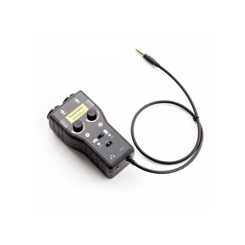 The Saramonic SmartRig+ is an audio adapter that allows the use of almost any audio equipment with recording devices such as VDSLR cameras, camcorders or smartphones. The SmartRig+ is equipped with two mini Jack (3.5 millimetre) inputs and two XLR / Jack (6.35 millimetre) inputs. These allow microphones, consoles or guitars to be connected to a recording device with a mini Jack (3.5 millimetre) connector. Independent level control for both supported channels, switching between mono and stereo modes, and a headphone output for listening make audio work easier. The adapter also offers phantom power support for microphones. The housing of the unit is made of high-quality plastic. The 1/4″ female tripod mount allows the adapter to be mounted on any photographic tripod and a wide range of other mounts. Specifications Power supply: 9 V battery 48V phantom power supply inputs: 2 x XLR / Jack 6.35 mm inputs. inputs: 2 x mini Jack 3.5 mm output: 1 x mini Jack 3.5 mm Input: 1 x mini Jack 3.5 mm response bandwidth: 20 Hz – 20 kHz harmonic distortion (THD): less than 0.01% @ 1 kHz, – 30 dBu signal-to-noise ratio (SNR): 80 dB @ 1 kHz, – 30 dBu independent level control for both channels + 20 dB ~ – ∞ adapter mounts: 1/4 “female tripod mount dimensions: 12 x 4 x 4 cm weight: 130 g Contents of the kit SmartRig+ adapter adapter pouch
