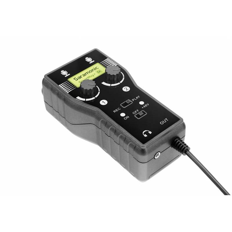 The Saramonic SmartRig+ Di is an audio adapter that allows the use of any audio equipment with Apple-branded mobile devices equipped with a Lightning connector (iPhone, iPad or iPod). The SmartRig+ Di is equipped with two mini Jack TRRS (3.5mm) inputs and two XLR / Jack TRS (6.35mm) inputs to connect a microphone, console or guitar. Phantom power support ensures wide compatibility for supported microphones. The output signal is transferred to a smartphone or tablet via a Lightning cable. The adapter allows independent level control for both supported channels as well as switching between mono and stereo modes. It also features a headphone output for listening to recorded audio in real time. The device’s interface is perfect for situations where you are recording two sound sources simultaneously, such as an instrument and vocals. The adapter is compatible with most audio recording applications available in the App Store. The housing of the device is made of high-quality plastic. The female tripod mount (1/4″) allows the adapter to be mounted on any camera tripod and many other mounts. Specifications power supply: 9 V battery 48V phantom power supply signal inputs: 2 x XLR / Jack TRS (6.35 mm) 2 x mini Jack TRS (3.5 mm) signal output: Lightning plug with 50 cm cable headphone output: mini Jack TRRS (3.5 mm) frequency response: 20 Hz – 20 kHz (+/-0.5 dB) signal gain: 25 dBu to – ꚙ signal-to-noise ratio (SNR): 78 dB @ 1KHz, -30 dBu harmonic distortion (THD): less than 0.01% @ 1 kHz, -30 dBu sampling frequency: 44.1 KHz or 48 KHz dimensions: 12 x 4 x 4.2 cm weight: 130 g Compatibility audio equipment equipped with XLR / Jack TRS (6.35 millimetres)/ mini Jack TRRS (3.5 millimetres) Apple mobile devices equipped with a Lightning socket, such as: iPhone 5 / 5S / 6 / 6S / 7 / 8 / X iPad iPod Touch Contents of the kit SmartRig+ Di adapter adapter pouch attachment strap