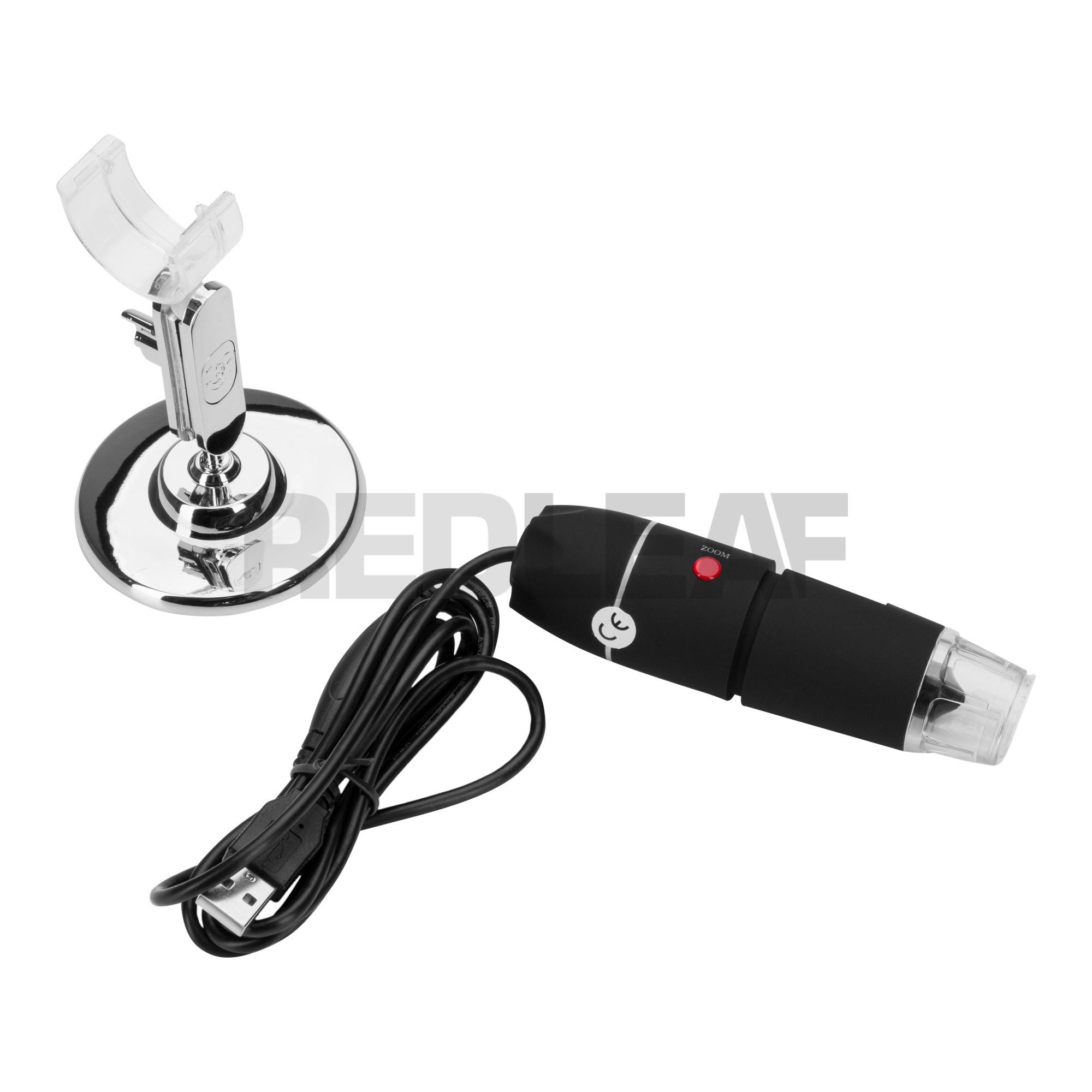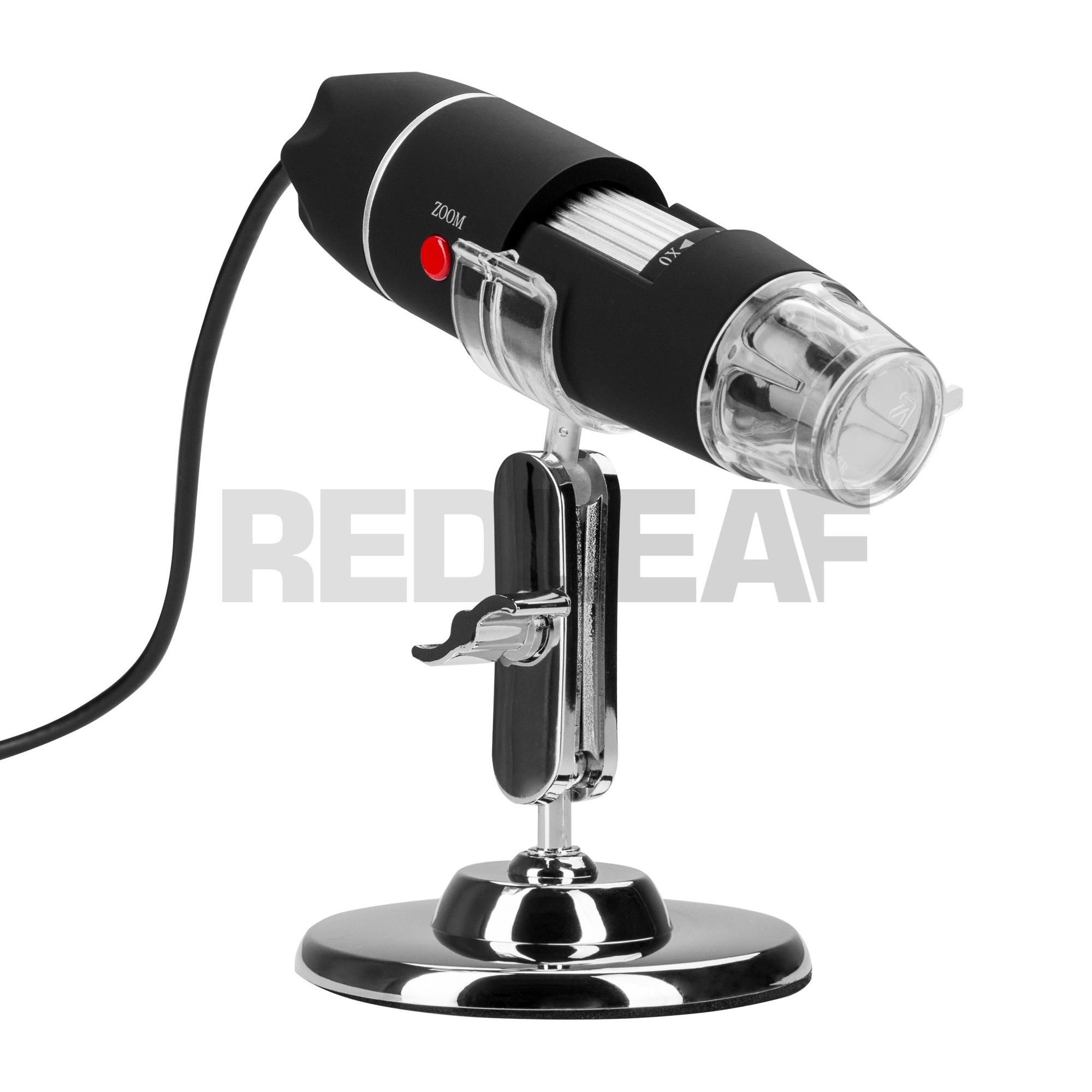 The movable arm, based on two ball heads, allows you to quickly and comfortably position the microscope at the right angle and then lock it in the optimal position. Once the correct distance from the microscope has been set, the focus of the image will be adjusted by means of a dedicated knob located on the housing of the device. In addition, the USB power cord is equipped with a backlight power control module. All the knobs are within easy reach, so it only takes a few seconds to find the optimal position for the microscope. Image quality The Redleaf RDE-11600U USB digital microscope offers a 1600x zoom to see the finest details of objects viewed on a micro scale, on a computer or smartphone screen. The 24-bit processor installed in the device allows you to capture high quality images, which can be recorded in the form of movies or photos with different resolutions. Dedicated software The set with the Redleaf RDE-11600U microscope also includes a CD with dedicated software for Windows, which makes it easy to save photos and videos and adjust parameters such as brightness, contrast, hue, saturation, sharpness and much more. In addition, Apple computer users can capture images from the microscope using native system applications such as QuickTime Player and Photo Booth. The driver board also includes dedicated software for Android. However, connecting the microscope to a smartphone requires an OTG cable, which is not included. Specification – model: USB digital microscope Redleaf RDE-11600U – maximum approximation: x1600 – light source: 8 LEDs – frame rate per second: 30 f/s with 600 LUX illumination – backlight adjustment: from 0 to 3000 LUX (knob placed on the cable) – digital zoom: x5 – sharpening range: from 0 to 40 mm (manual) – photo resolution: from 160 x 120 to 6324 x 4742 px – video resolution: 640 x 480 px – supported operating systems: Windows (XP, Vista, Win7/8/10), Mac, Linux – USB Type A connector (compatible with USB 1.1, USB 2.0, USB 3.0 and OTG) Set contents – microscope – Transparent decantation – armrest – adjustable arm – calibration card – Driver and software CD