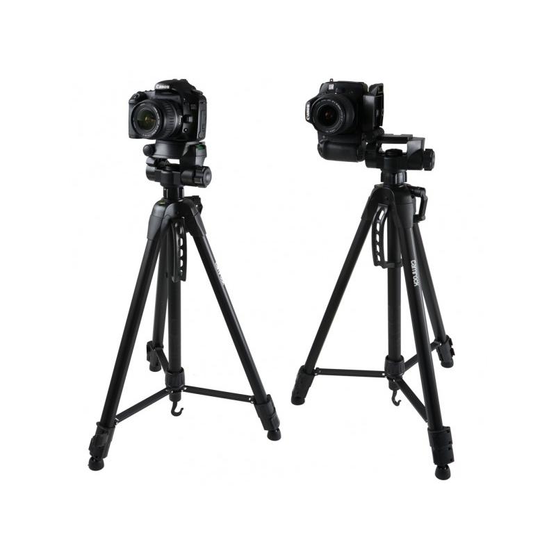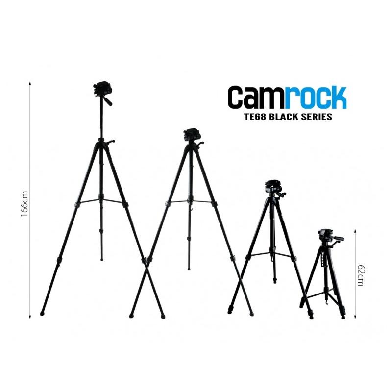 The Camrock TE68 Black is a semi-professional, extra-high aluminium tripod. Thick legs with a special cross-section guarantee exceptional stability and strength. It is made extremely solidly from reinforced aluminium. Excellent for use with SLR cameras, heavier digital cameras and camcorders. Main product features high quality construction in reinforced aluminium convenient 3D head with spirit level high stability and robustness high quality and robustness convenient carrying handle convenient carrying handle self-levelling feet flexible feet extendable cranked column three-segments three-segment legs hook to load the set Fast and simple handling of the set. quick and easy operation free and easy to use bag with strap included It has a 3D head with quick release, double level, extendable column with crank and handle. The tripod also has a hook to attach a load and feet with joints, greatly improving stability. Specifications Model: Camrock TE68 Black Max.orking height with head: 168 cm Min. working height with head: 62.3 cm Folded height with head: 63.7 cm Number of leg sections: 3 Weight of tripod/head: 2.5 kg Set contents Camrock TE68 Black tripod Guarantee 2 years (manufacturer’s warranty)