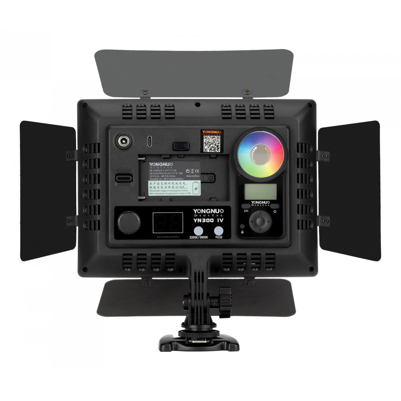 Yongnuo YN300 IV is a technologically advanced LED lamp, offering precise light temperature adjustment from 3200 – 5600 K and emitting countless colors from the RGB color space. In addition to standard modes, the YN300 IV features a variety of special effects, such as lightning, sunrise and police car lights. The flash can be operated wirelessly from the included remote control or a dedicated smartphone app. Excellent lighting quality Yongnuo YN300 IV panel is equipped with 316 LEDs with high color rendering index (CRI of 96+) and 60 SMD RGB LEDs, generating a huge palette of beautiful and saturated colors. When filming a scene illuminated with YN300 IV lamps we do not observe the “flickering effect”, which is a common problem of cheaper LED lighting. Wireless Control The YN300 IV is equipped with a radio signal receiver and can be controlled wirelessly using the included remote control or a smartphone with an app from Yongnuo installed. It is possible to connect multiple lights and assign them to 8 groups. The range of wireless control is 15 meters. Power and color of the emitted light can be continuously adjusted in 1 or 10 degree increments. The application can be downloaded from the manufacturer’s official website Special effects The lamp offers a number of predefined special modes. It enables simulation of more than 30 advanced lighting effects known from everyday life, such as: lightning flashes, atmospheric candlelight, sunrise, fireworks or flashing lights of a police car. With the dedicated smartphone app you can modify existing effects or program your own and combine them into sequences. Light modifiers The gates, which the YN300 IV lamp is equipped with, will allow you to precisely direct and focus the light beam on a given point of the scene. The set also includes a milky diffusion filter, which will beautifully soften the light emitted by the flash, and a warming filter. Three ways to power Depending on whether you’re working in the studio or outdoors, the Yongnuo YN300 IV lamp gives you three power options to choose from. An AC adapter (DC 12 V / 2 A) plugged into an outlet, a USB-C charger (9 – 15 V / 2 A) or an NP-F series mobile battery. The battery pack can be charged directly in the lamp. The USB-C port supports USB PD 3.0 fast charging technology, and we can check the current battery charge status on the remote control display. CAPACULATOR, POWER SUPPLY AND CHARGER ARE NOT PART OF THE SET Additional accessories and mounts The flash can be installed directly on the camera foot or on a lighting tripod with 1/4″ thread. The kit also includes a comfortable handle, allowing you to hold the lamp in your hand and a classic lamp stand. Specification model: Yongnuo YN300 IV – RGB, WB (3200 K – 5600 K) power: 24 watts light intensity: LEDs: max 2640 lux from 1 m distance LEDs: max 2640 lux from 1 m distance RGB LEDs: max. 685 lx from 1 m distance LEDs: max. 2640 lx from 1 m distance colour temperature of light: 3200 – 5600 K + RGB number of LEDs: 316 LEDs with light color temperature: 3200 – 5600 K 60 SMD RGB LEDs 60 RGB LEDs with light color temperature: 3200 – 5600 K LEDs 60 SMD RGB LEDs CRI: 96+ estimated lifetime of LED panel: 50000 h luminous angle: 55° / 110° wireless control range: 15 m power supply: rechargeable: one rechargeable NP-F type battery (not included) cable: one rechargeable NP-F type battery (not included) grid: DC 12 V / 2 A power adapter (not included) USB-C: 9 – 15 V / 2 A charger (not included) mounting: cold shoe 1/4 “female tripod thread Dimensions: 25.5 x 23.0 x 9.7 cm (box dimensions) Weight: 580 g (without accessories) weight: 580 g (without accessories) 1250 g (weight of the whole set) Photometrics Distance 0.3 m 0.5 m 1 m LEDs 15170 lx 7830 lx 7830 lx 2640 lx RGB LEDs 6310 lx 6310 lx 2610 lx 2610 lx 685 lx 685 lx Kit contents Yongnuo YN300 IV LED lamp – RGB, WB (3200 K – 5600 K) remote control battery for remote control (CR2032 3V) handle / lamp holder lamp stand warming color filter diffusion filter Case for lamp and accessories